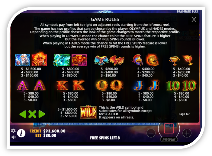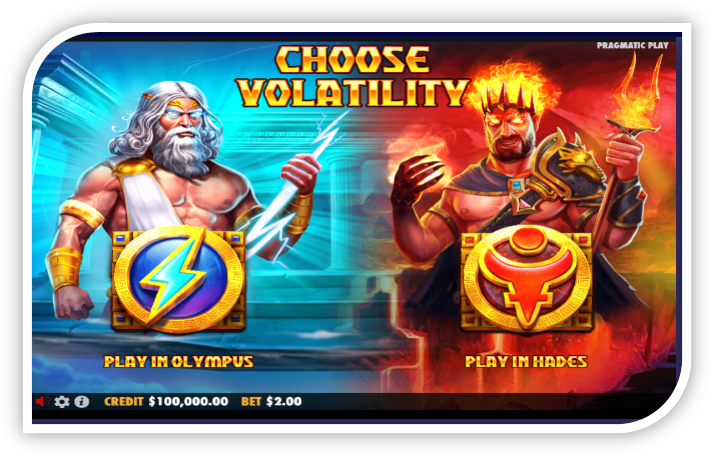 This slot game is set against the backdrop of ancient Greek mythology. The fairy depth of Hades and serene skies of Olympus are the two contrasting realms presented by the slot game. Players experience a tranquil blue environment in Olympus mode while in Hades mode it plunges into a flame Laden underworld. The game soundtrack complement the visual experience enhancing the epic atmosphere of the Divine confrontation.